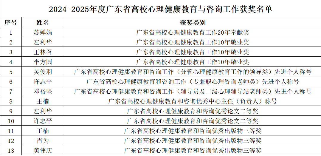 经过组委会专家严格评选,beat365体育官网荣获多项荣誉。在集体荣誉方面,beat365体育官网心理健康教育与咨询中心被授予“2024-2025年度广东省高校心理健康教育与咨询工作先进集体”荣誉称号。在个人荣誉方面,beat365体育官网教师获得“广东省高校心理健康教育工作20年奉献奖”1项,“广东省高校心理健康教育工作10年敬业奖”3项,“广东省高校心理健康教育和咨询优秀中心主任(负责人)称号”1项,“广东省高校心理健康教育和咨询工作先进个人称号”3项,优秀论文、出版物5项。